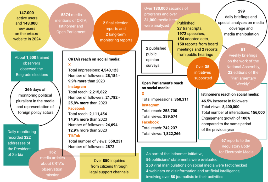 By the end of 2024, the CRTA team consisted of over 80 individuals distributed across thematic program departments for elections, quantitative and qualitative research, legal analytics, media monitoring, support for formal and informal activist initiatives, communications, media and field campaigns, finances, administration and IT. Under the auspices of CRTA, the Open Parliament operates, an initiative for a more transparent and quality work of the Parliament as a key democratic institution in the parliamentary democracy system, and Istinomer, the first online fact-checking media outlet in the Western Balkans region.